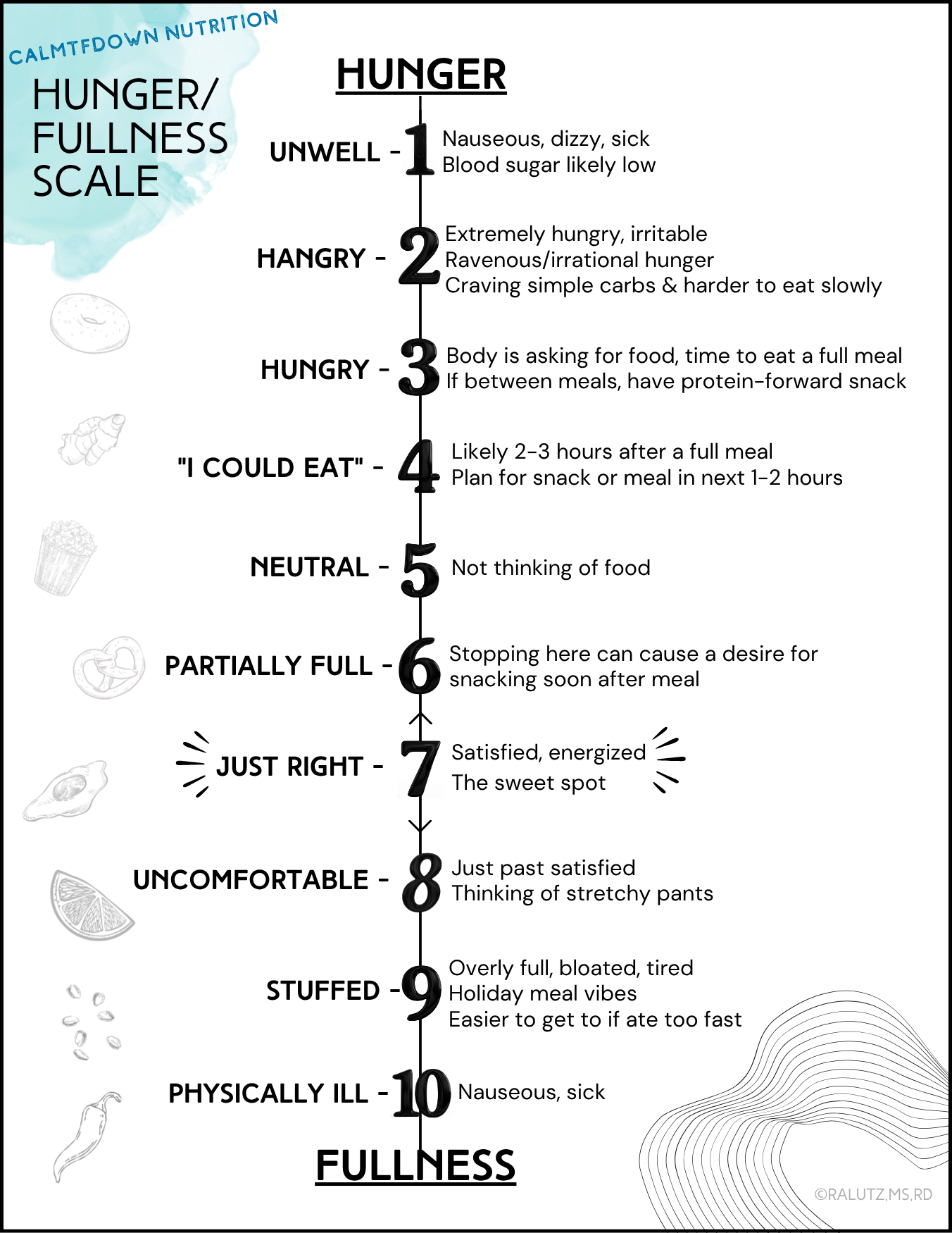 There’s no single, perfect way to use this. It’s not a scale that requires precision. It’s a tool for pattern recognition. Whether we do or don’t feel hunger throughout the day is information. When we feel hunger is information. How full we feel after a meal is information. Once we have the info, we use it to strategize. This is a tool that takes time to work with. You can absolutely try it on your own, but, if you can, learning how to use this tool by working with a Registered Dietitian (RD/RDN) or Certified Nutrition Specialist (CNS) is ideal.