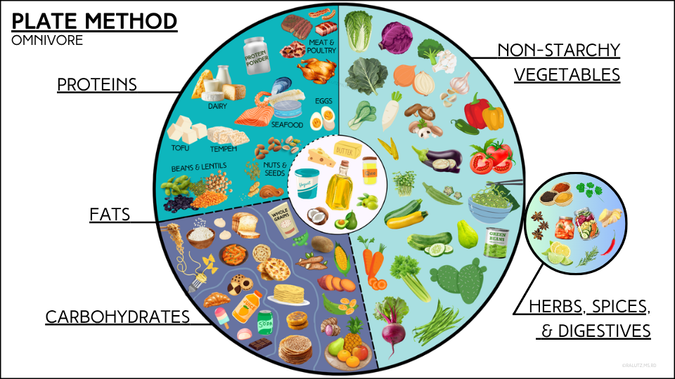 For snacks throughout the day, try to pair carby foods (crackers, chips, granola bars, etc.) with a source of protein and fats so they last longer. The other top nutrition tool, The Plate Method (pictured above), can be helpful for this. Here’s a link to my post on that.